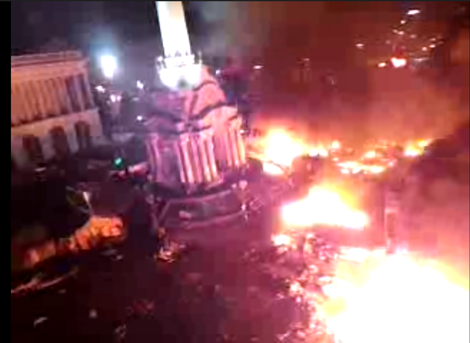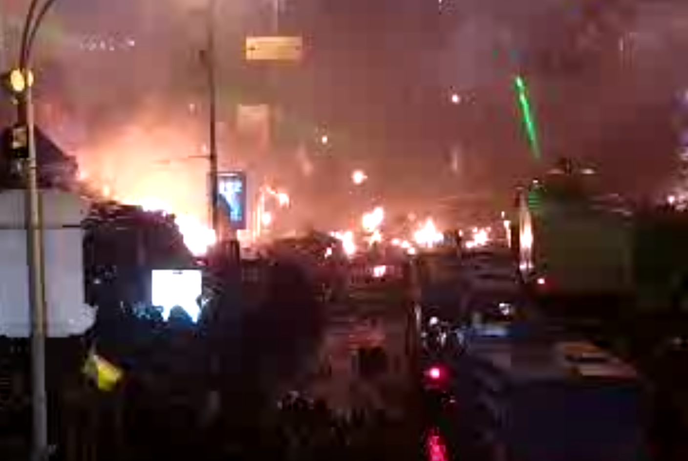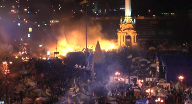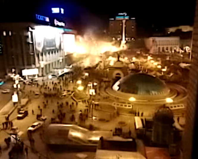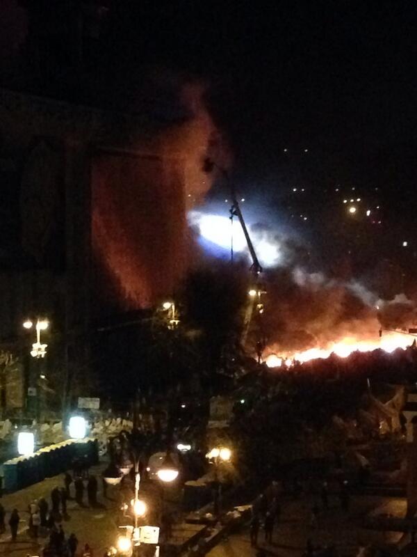 Fire and fireworks in Kiev’s central square as death toll rises to 9 and police move in on protest camp. pic.twitter.com/cHXNMq6XSN
