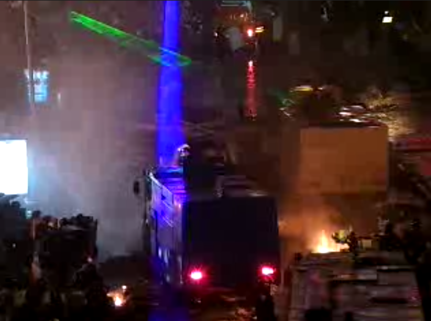 1810 GMT: CHAOS – Police are firing water cannons, protesters are shining lasers and firing fireworks at police”