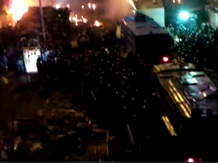 1804 GMT: We’ve embedded the livestream at the top. Intense fires are now burning. The explosions come at a rate of anywhere between 1 every few seconds and 4-10 a second. The government has sent hundreds, perhaps thousands, of police against the protest lines, and they have pushed through.
