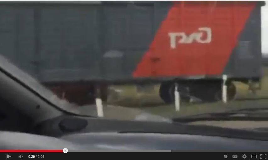 The second video shows a convoy moving on the railroad with some rail cars showing the “Russian Railways” logo nearby. It is labeled “Russian troops moving toward the Ukrainian border 8 August.”
