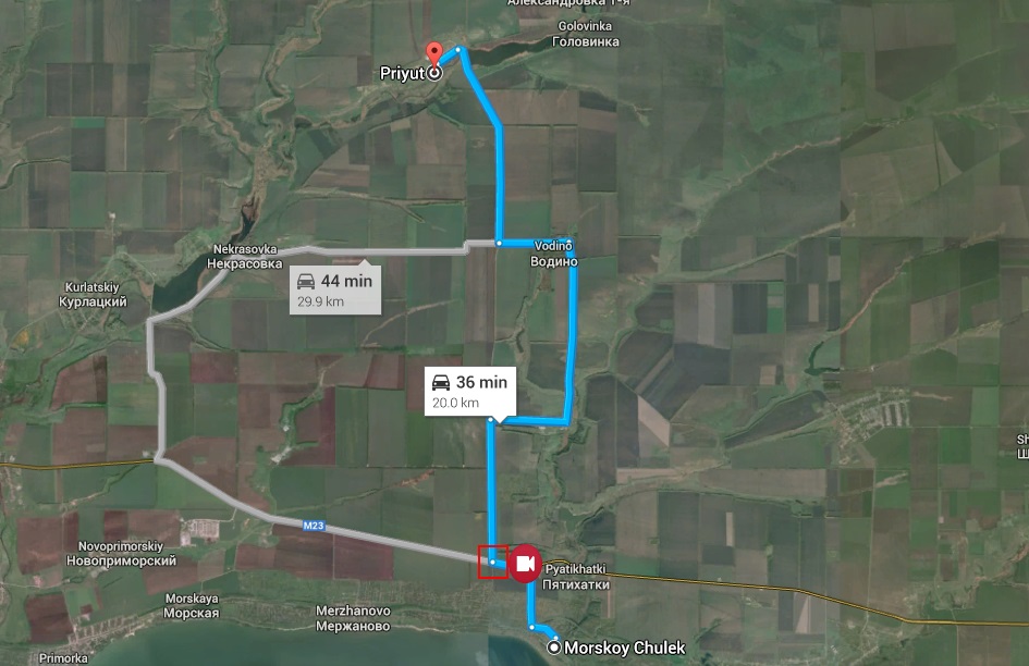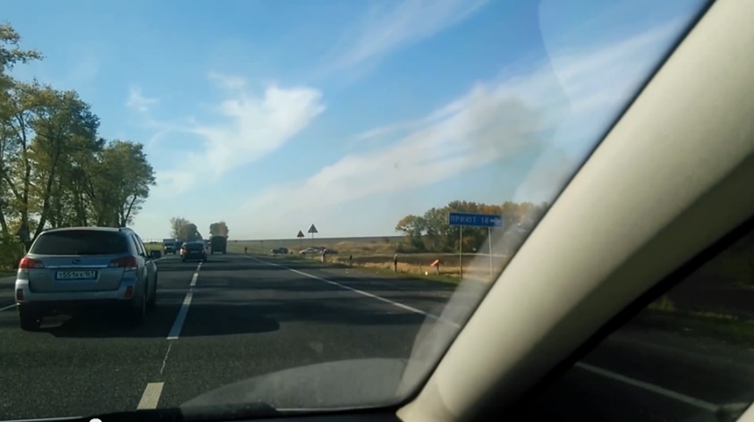 At 0:20 a sign can be seen that says “Priyut 18 km.” This is the turn-off for the road to Priyut.