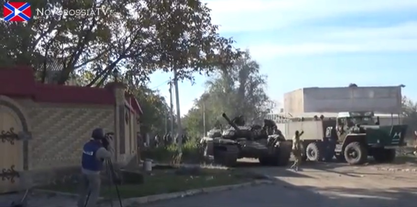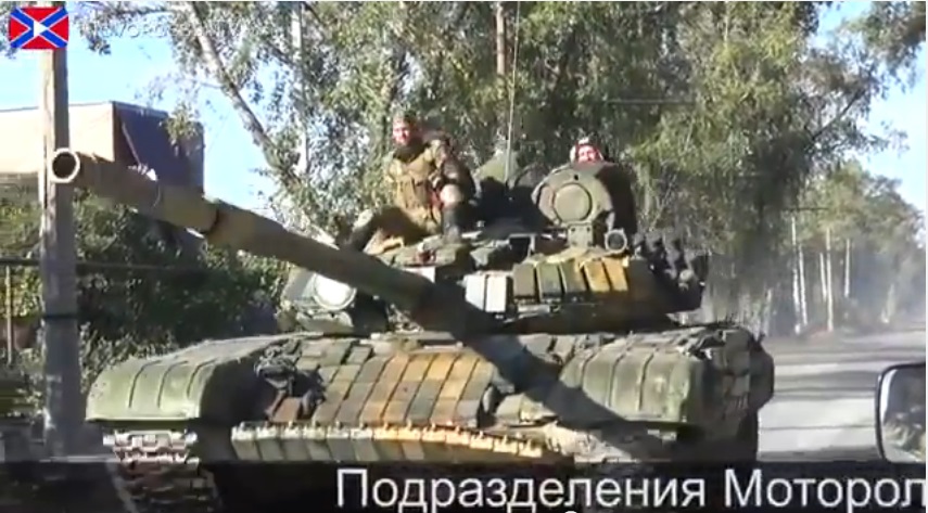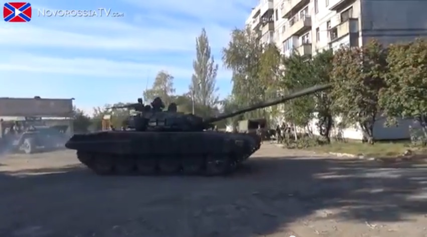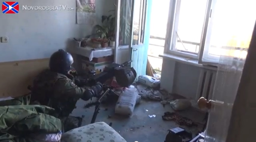 Today’s video shows the fighters on their way to the airport in a T-72 tank of the type that can only be obtained from Russia, then outside the airport with a tank and truck. They then return to fire from a top floor of the apartment building.
