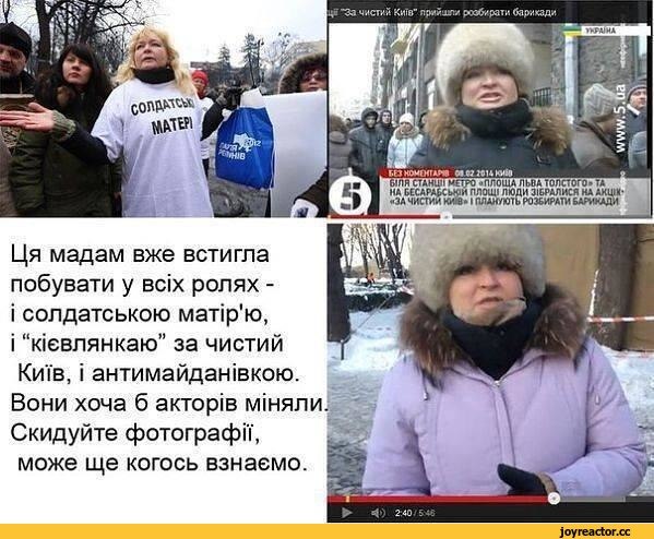 Translation: These ladies have already appeared in a number of entertaining roles — as a soldier’s mother, a Kiev resident for a clean Kiev, and an anti-Maiden activist. They should at least change the actors. Send your photographs, maybe you will recognize them.